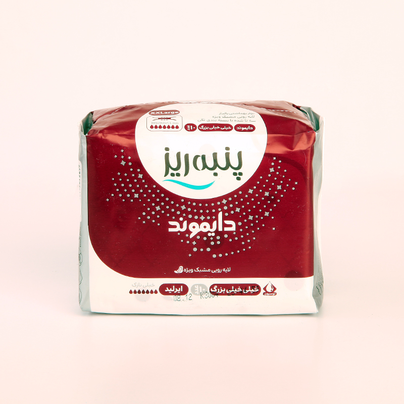 نوار بهداشتی بالدار و مشبک دایموند پنبه ریز سایز خیلی خیلی بزرگ به دلیل دارا بودن لایه ایرلید، جذب فوق العاده بالایی دارد. با توجه به این موضوع، نوار بهداشتی دایموند پنبه ریز برای بانوانی که در دوران عادت ماهانه خونریزی بسیار شدیدی دارند، مناسب است. لایه رویی این نوار بهداشتی، مشبک و بسیار با کیفیت بوده و در عین حال بسیار نرم و لطیف و به هیچ وجه حساسیت زا نیست. نوار بهداشتی پنبه ریز دایموند در دو سایز بزرگ و خیلی خیلی بزرگ و در بسته بندیهای 8 عددی به بازار عرضه شده است.