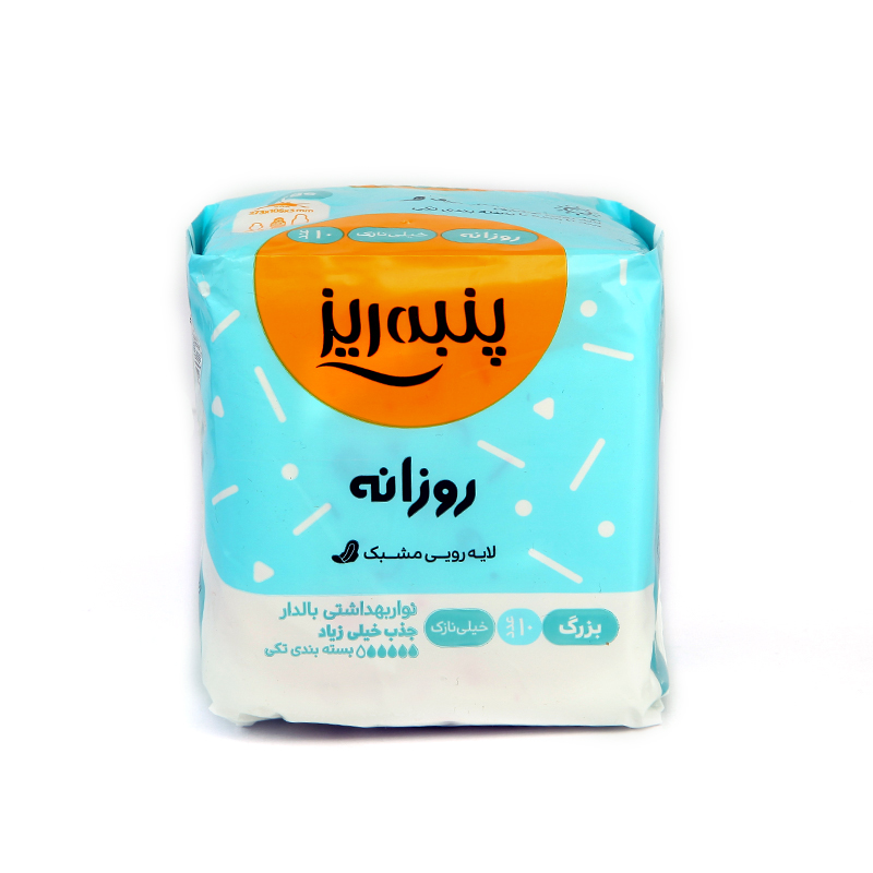 نوار بهداشتی خیلی نازک، 5 قطره پنبه ریز با جذب بالا، رویه مشبک و بدون ایجاد حساسیت تمام ویژگی های یک نوار بهداشتی مناسب و با کیفیت را دارد. مشبک بودن لایه رویی نوارهای روزانه موجب افـزایش قدرت جذب میشود. مخاطب این نوع از محصول بانوانی هستند که خونریزی زیادی دارند. نوار بهداشتی از محصولاتی است که خانمهای بالغ در طول ماه به آن نیاز دارند به همین دلیل باید از محصولاتی استفاده کرد که باعث افزایش ناراحتیهای دوران عادت ماهانه نشود. انتظار بیشتر خانم ها در هنگام استفاده از نوار بهداشتی قدرت جذب و راحتی آن است. نوار بهداشتی پنبه ریز با بررسی حساسیت های ناشی از استفاده مداوم از نوار بهداشتی، محصولی کاملا راحت و ضد حساسیت می باشد که به هیچ عنوان در زمان استفاده از آن دچار حساسیت نخواهید شد. نوار بهداشتی بالدار بزرگ روزانه پنبه ریز بسیار نازک بوده و و با مواد جاذب قوی هر گونه رطوبت را به خود جذب می کند. در داخل هر بسته نوار بهداشتی بالدار پنبه ریز 10عدد پد با لایه مشبک وجود دارد که برای مصرف روزانه در این دوران قابل استفاده است.