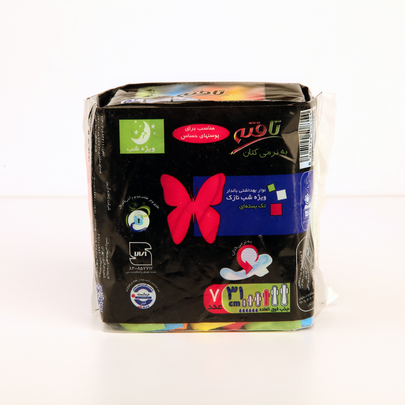 نوار بهداشتی خیلی نازک پوستهای حساس تافته، بسیار نازک و مخصوص شب می باشد. طول این نوع نوار بهداشتی تافته 31 سانتی متر با جذب عالی می باشد. رویه بیرونی از جنس کتان و نرم و لطیف می باشد. استفاده از این نوع نوار بهداشتی تافته به افرادی که پوست حساس دارند توصیه می شود. تعداد نوارها 7 عددی می باشد که هر نوار در یک لفاف پلاستیکی جداگانه قرار دارد.