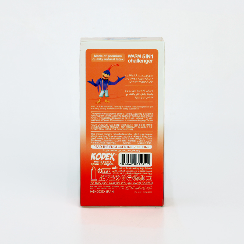 کاندوم وارم چلنجر 5 در 1 کدکس با لوبریکانت های LA و NI فرموله شده که در رفع زودانزالی آقایان نقش موثری دارد.