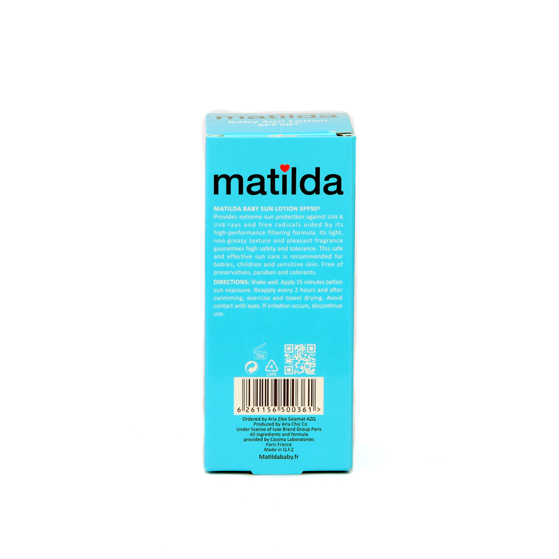 لوسیون ضدآفتاب Matilda Baby Sun Lotion SPF 50+ یک محصول تخصصی و بسیار ایمن برای محافظت از پوست لطیف و حساس نوزادان و کودکان است. این ضدآفتاب با بهرهگیری از فیلترهای قوی و پایدار، محافظت وسیعالطیف (UVA & UVB Broad Spectrum) را فراهم کرده و از آسیبهای ناشی از نور خورشید، آفتابسوختگی، خشکی و ایجاد لکهای پوستی جلوگیری میکند.