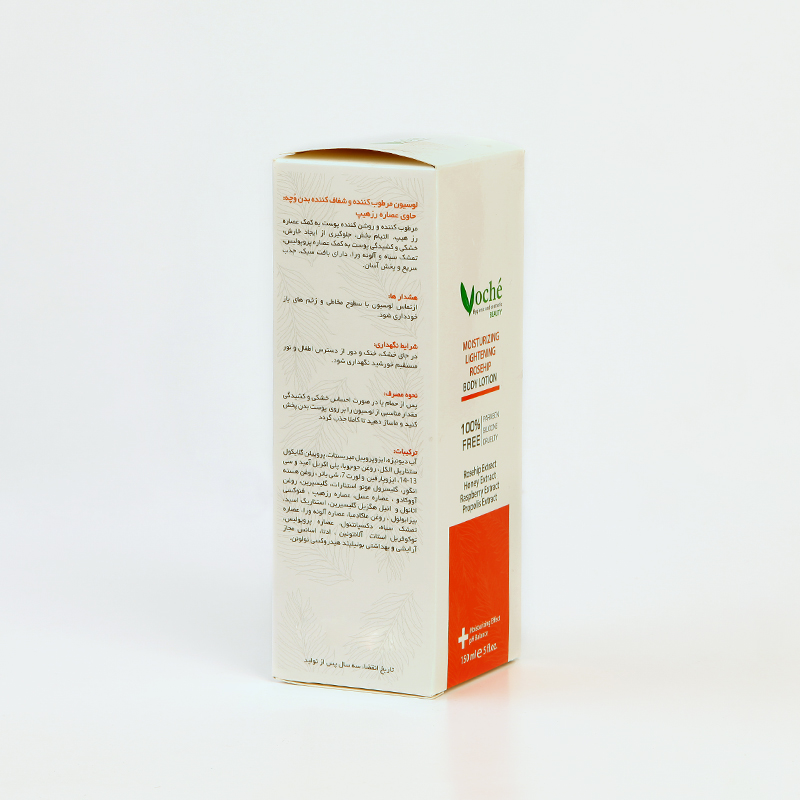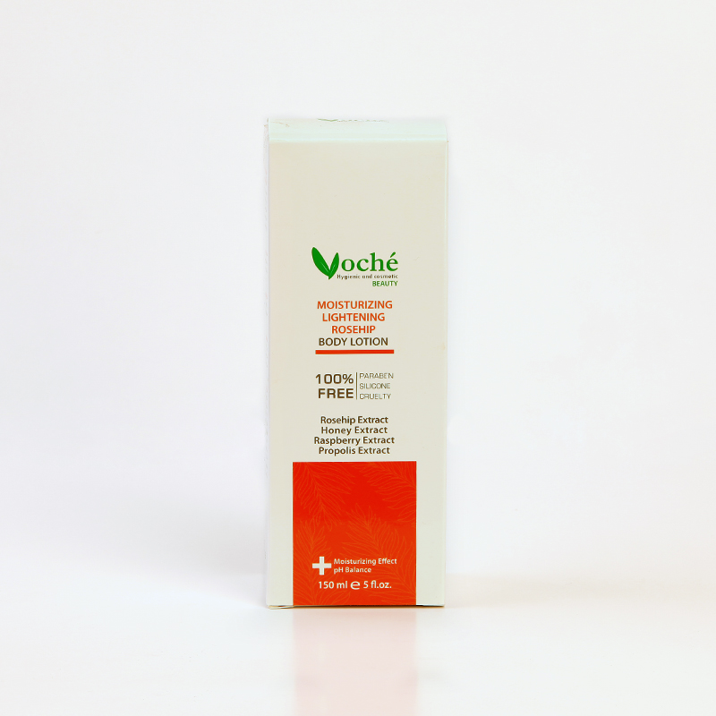 لوسیون بدن Voché Rosehip Body Lotion یک مرطوبکننده حرفهای و روشنکننده مناسب انواع پوست است که بافتی سبک، جذب سریع و ماندگاری بالا دارد. فرمولاسیون غنی این محصول با وجود عصاره رزهیپ، عسل، تمشک و پروپولیس علاوه بر رطوبترسانی عمیق، به بهبود بافت پوست، افزایش لطافت، کاهش تیرگیها و کمک به بازسازی سلولی کمک میکند.