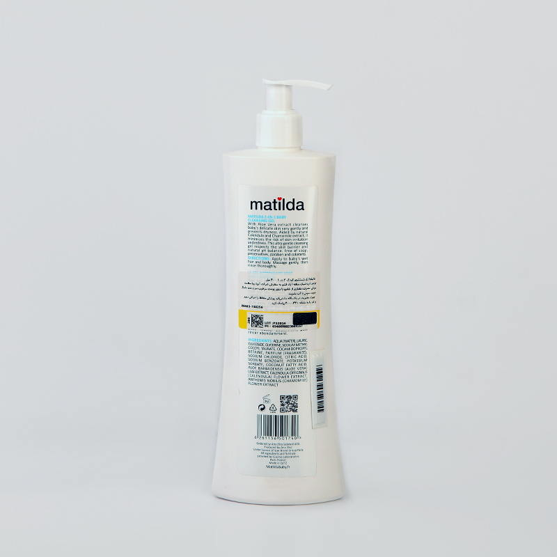 ژل شستشوی 2 در 1 ماتیلدا با فرمول بسیار ملایم و بدون اشک، برای شستشوی روزانه موی سر، صورت و بدن کودکان طراحی شده و باعث نرمی و آرامش پوست میشود.
