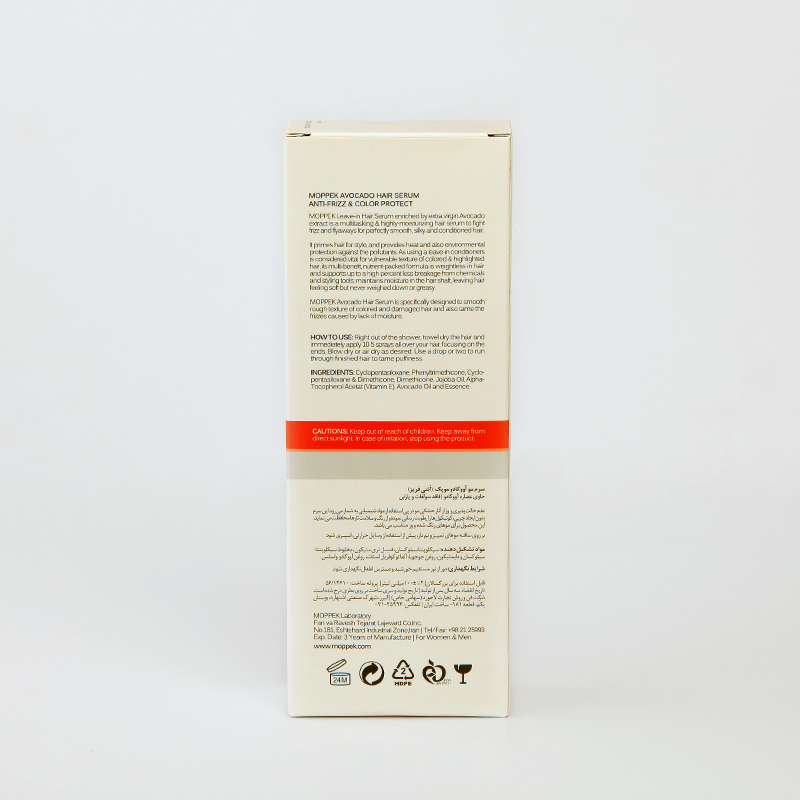 سرم موی آووکادو مپک (Moppek) ضد وز و نرمکننده، محافظتکننده رنگ برای موهای رنگشده و آسیبدیده – 100 میل