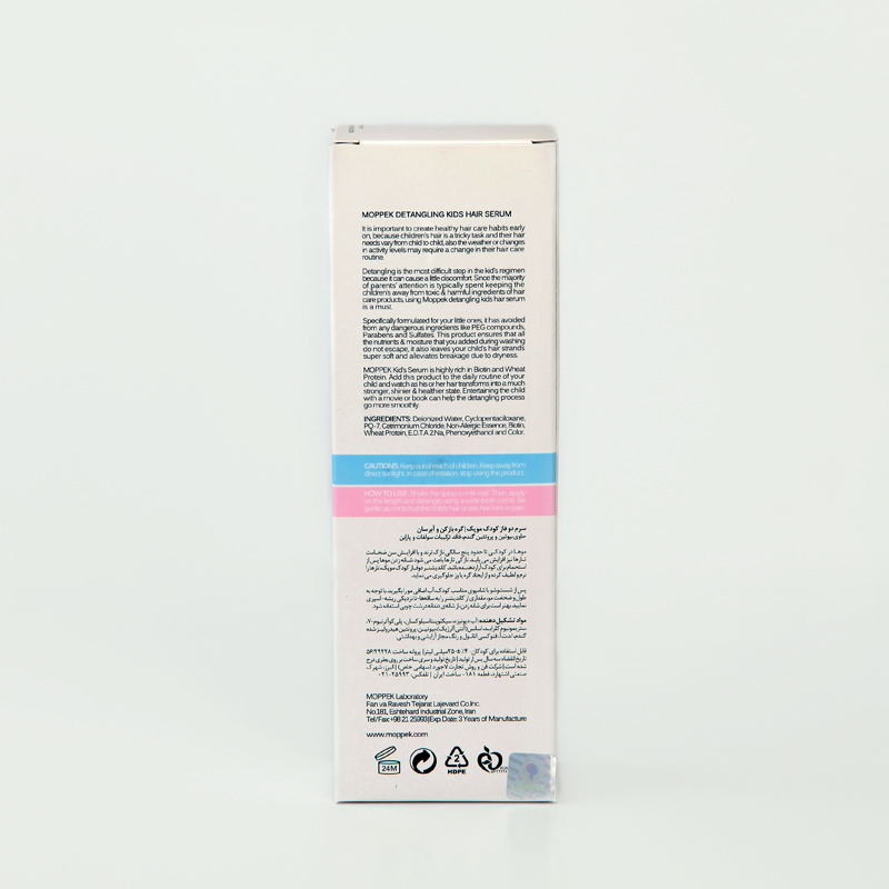 اسپری دو فاز Kids Moppek یک نرمکننده و آبرسان ملایم مخصوص کودکان است که برای مراقبت از موهای ظریف، خشک یا مستعد گرهخوردگی طراحی شده است. این محصول با فرمول فاقد SLS، SLES و پارابن، بدون ایجاد حساسیت یا تحریک پوستی، به لطافت و سلامت مو کمک میکند. لایه آبرسان آن رطوبت لازم را تأمین کرده و لایه روغنی سبک، باعث کاهش وز و افزایش شانهپذیری مو میشود. استفاده منظم از این اسپری به باز شدن آسان گرهها، جلوگیری از کشیدگی و آسیب در زمان شانهزدن و افزایش نرمی و درخشندگی مو کمک میکند. با بافت سبک و رایحه دلپذیر، این محصول انتخابی مناسب برای مراقبت روزانه از موهای کودکان است و مو را مرتب، نرم و خوشحالت نگه میدارد.
