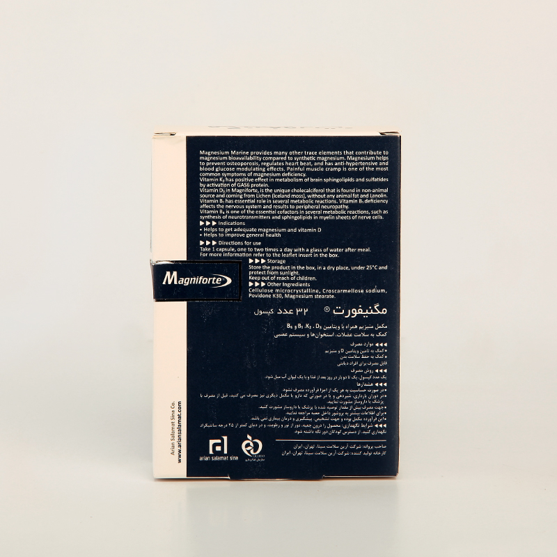 کپسول Magniforte یک مکمل چندمنظوره قدرتمند است که برای حمایت از عملکرد طبیعی عضلات، تقویت استخوانها و افزایش آرامش عصبی طراحی شده است. وجود منیزیم دریایی در این محصول به رفع اسپاسم، گرفتگی عضلات، خستگی و استرس کمک میکند. ترکیب ویتامینهای B1 و B6 نقش مهمی در تولید انرژی و عملکرد سیستم عصبی دارند. ویتامین D3 طبیعی موجب جذب بهتر کلسیم و بهبود تراکم استخوان میشود و ویتامین K2-7 آن را بهصورت مؤثر در استخوانها تثبیت میکند. استفاده از این مکمل برای افرادی که دچار ضعف عضلانی، استرس، کمبود ویتامینها یا فعالیت بدنی زیاد هستند انتخابی ایدهآل است.