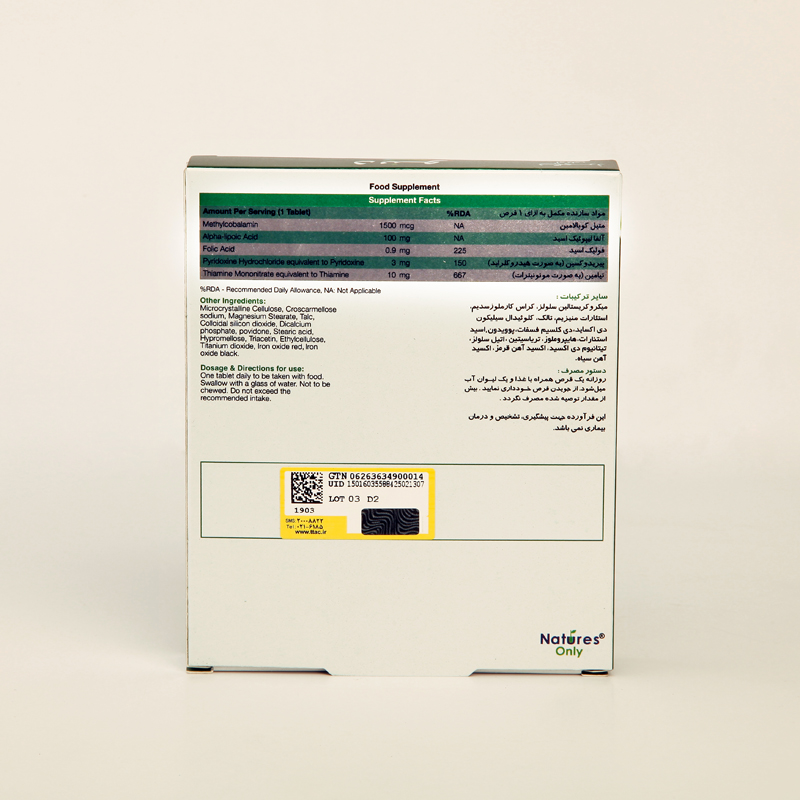 قرص Dino Nature’s Only یک مکمل تغذیهای نورو-اسپسیفیک (Neuro-Specific) است که با هدف حمایت از سلامت سیستم عصبی و محافظت از اعصاب در برابر آسیب طراحی شده است. این محصول حاوی ترکیبات فعال و مؤثری مانند متیلکوبالامین (ویتامین B12 فعال)، آلفا لیپوئیک اسید، فولیک اسید، پیریدوکسین (B6) و تیامین (B1) میباشد که نقش مهمی در عملکرد طبیعی اعصاب دارند.